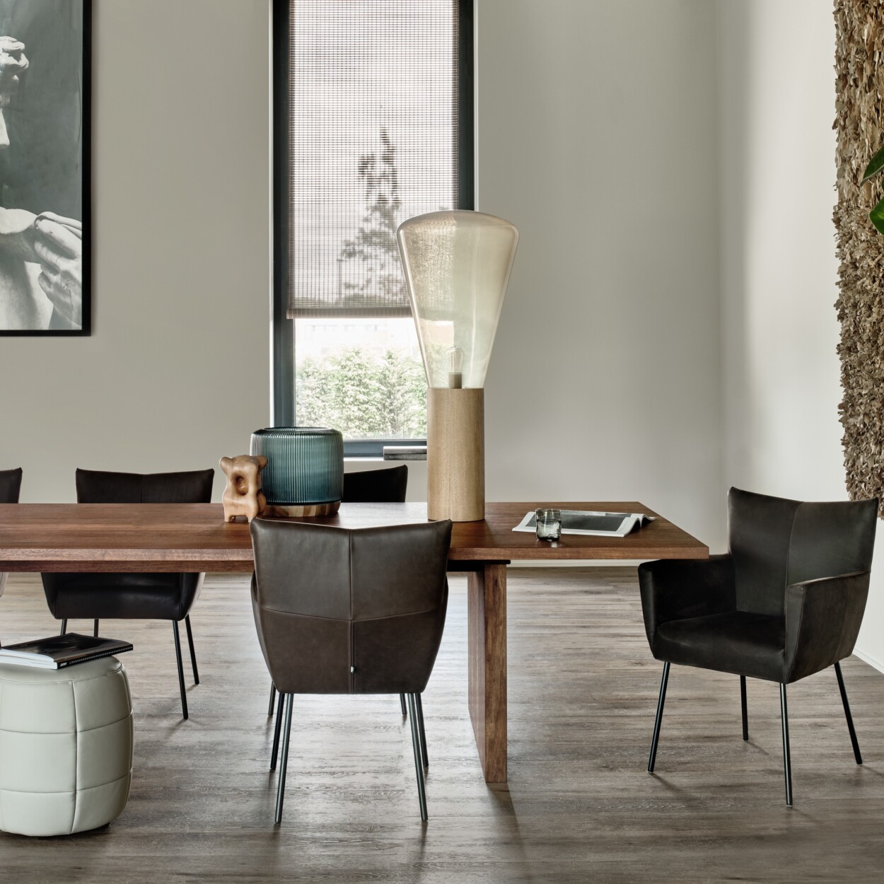 Amra is een eetkamerstoel met een nonchalante uitstraling en een flexibele rug die zich aanpast aan uw zithouding.